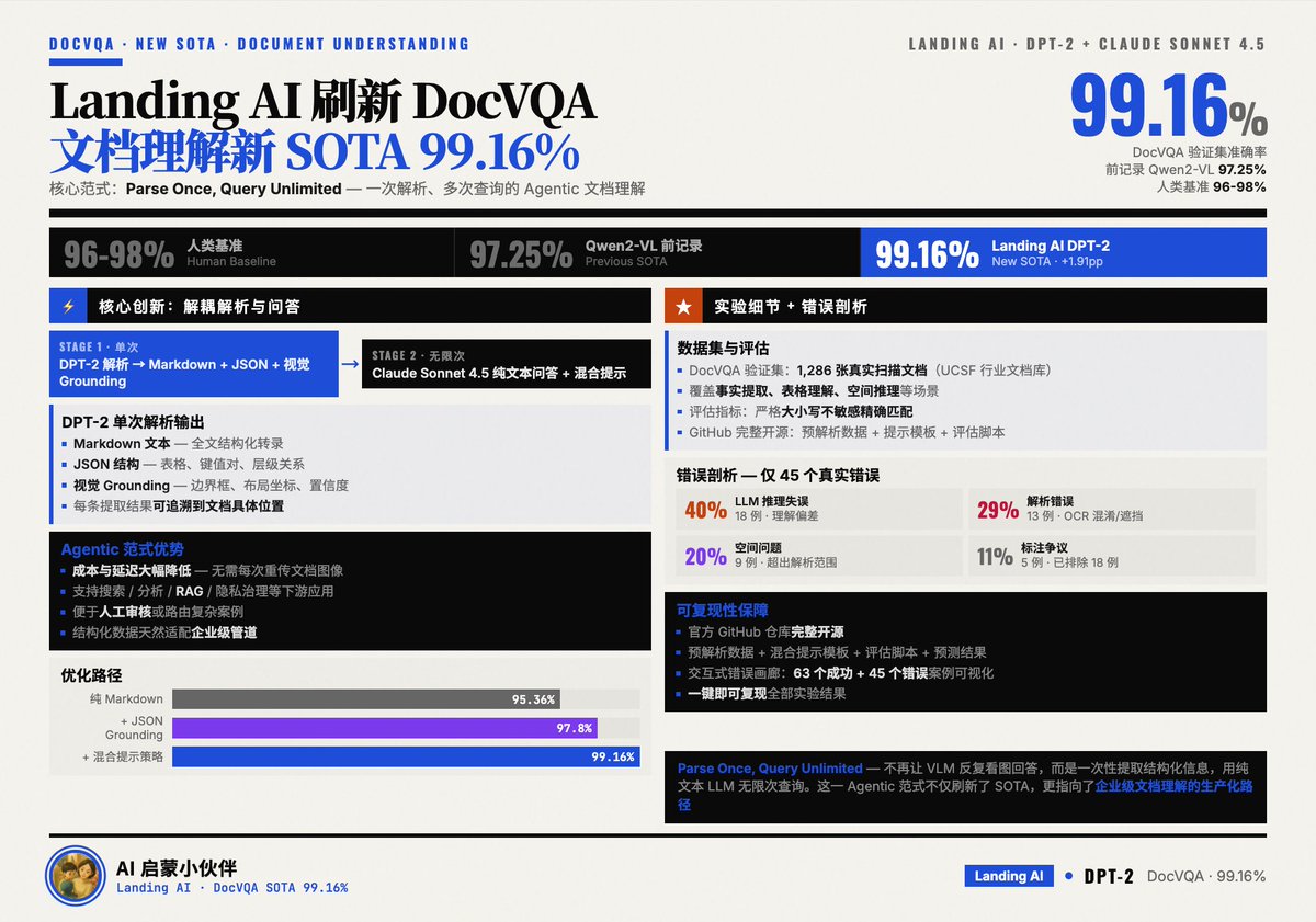 Landing AI set a new record in the DocVQA benchmark with 99.16% accuracy, surpassing human benchmarks, by revolutionizing document understanding with an “one-parse, multiple-query” Agentic paradigm. This innovative model significantly reduces costs and latency for indie developers who need to process large volumes of documents and extract information, while also supporting a wider range of downstream applications.