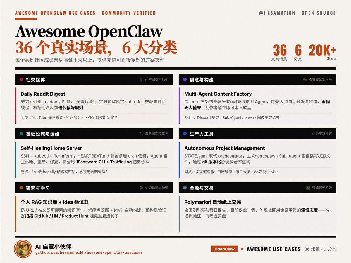 Awesome OpenClaw Use Cases compiles 36 real-world open-source solutions across 6 major categories, including social media automation, multi-agent creation factories, and self-healing home servers. Indie developers can draw inspiration and reusable solutions from these, leveraging AI Agents to solve practical pain points and quickly build automation tools or SaaS products, such as content creation automation, intelligent operations, or decentralized project management.